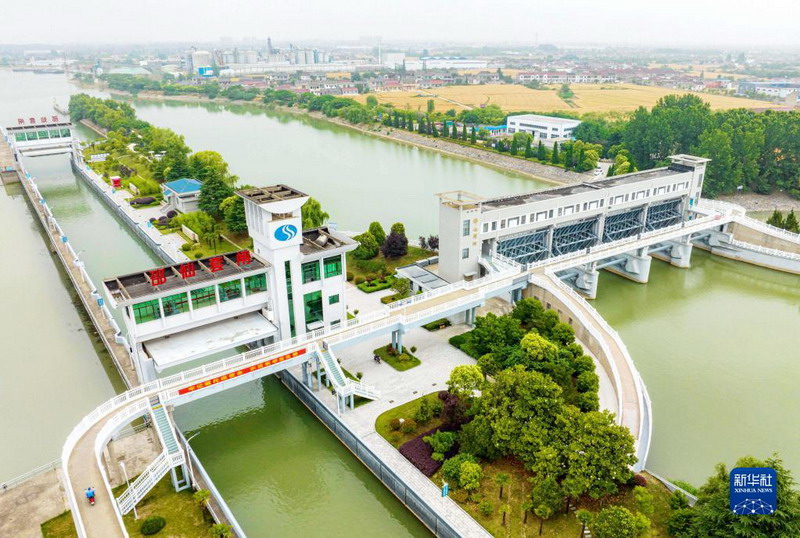 這是6月1日拍攝的位于江蘇省揚(yáng)州市江都區(qū)的南水北調(diào)東線一期工程邵仙套閘、邵仙閘洞(無(wú)人機(jī)照片)。